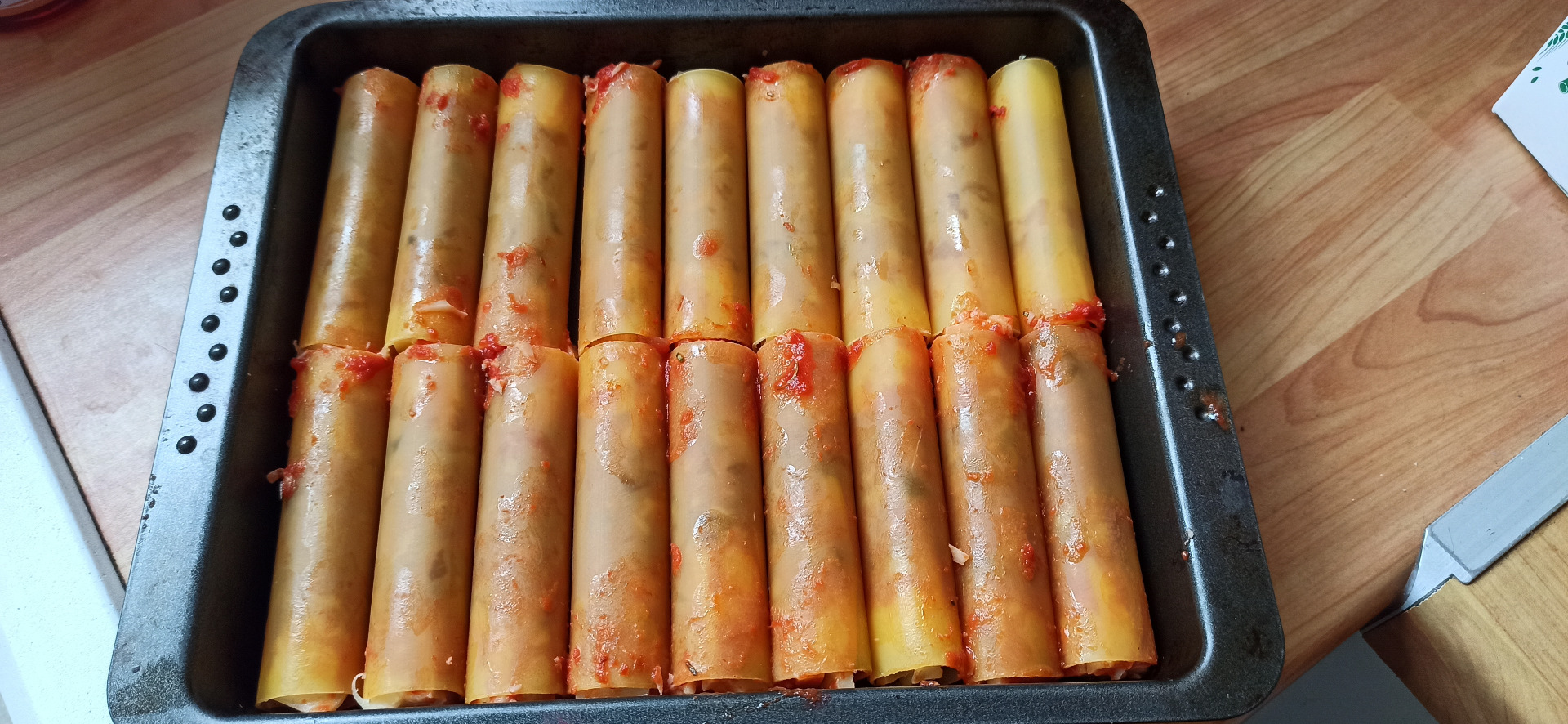 Farcir les tubes de cannellonis de cette préparation, en fermant les extrémités par des morceaux de gruyère.