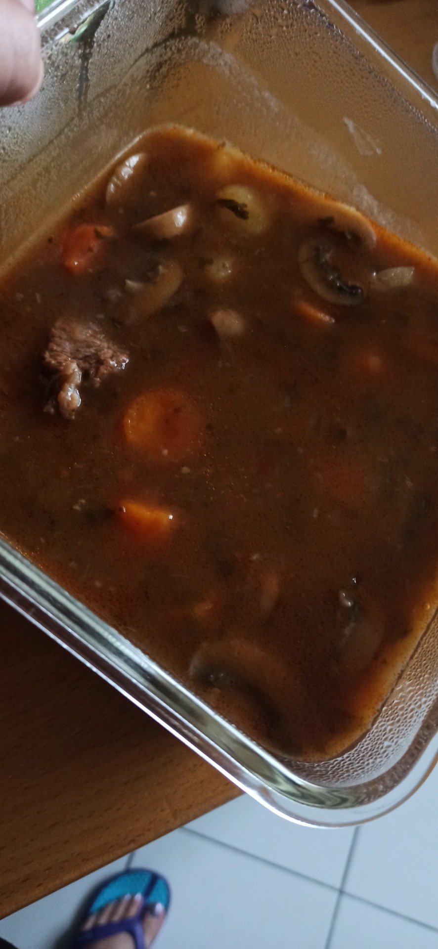 Une fois la viande bien dorée, ajouter les carottes en rondelles et mouiller avec le jus de raisin + eau jusqu'à recouvrir la viande. Poivrer uniquement.